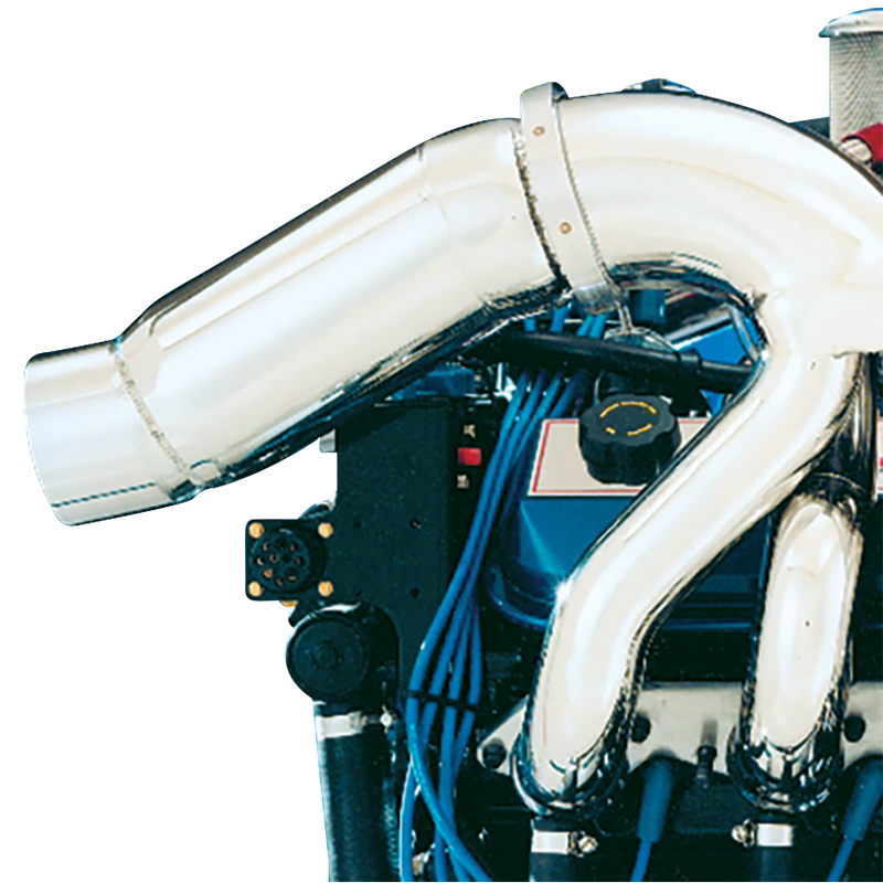 This tailpipe is specifically for Mercury Racing engines and hits the transom at 14″ off crankshaft centerline and 9.5″ up from crankshaft centerline. These tails are sold as a pair, they have a Mercury flat flange, they are polished stainless and they adapt to a 4″ exhaust tip. These tails are made to order, call for current lead times